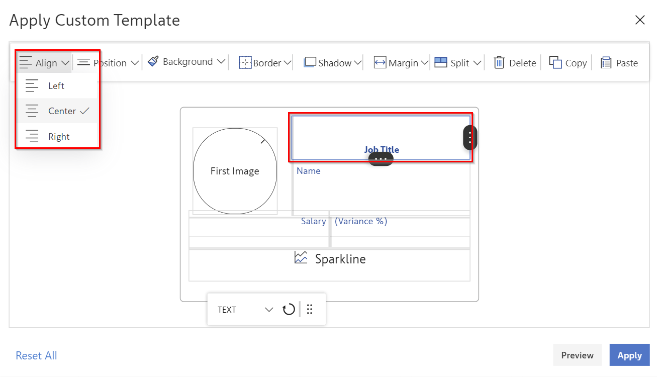We can align and reposition values in the custom template using the "Align" and "Position" options.
