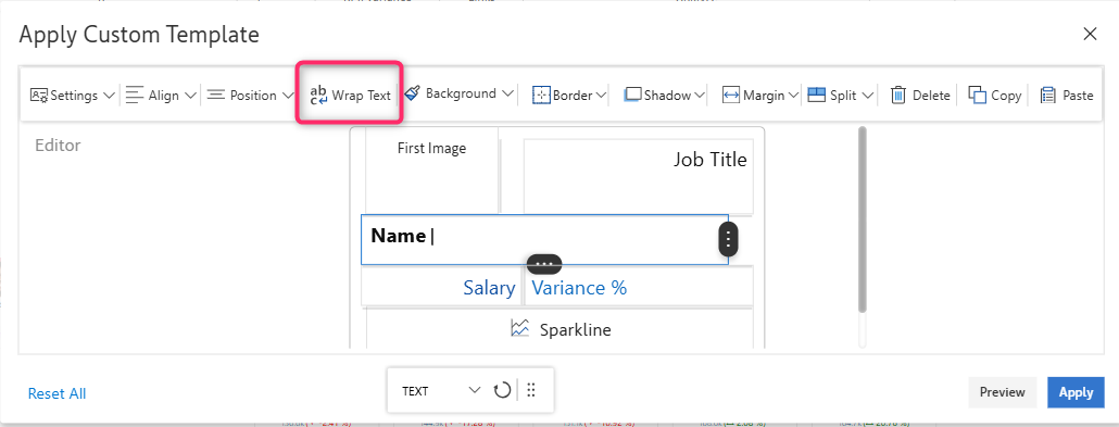 <figure><img src="https://382510089-files.gitbook.io/~/files/v0/b/gitbook-x-prod.appspot.com/o/spaces%2FIuuIZWiXEx25eV75hmmJ%2Fuploads%2FdCL9s0EXZ8hRj3HznLwT%2F0.png?alt=media" alt=""><figcaption><p>Image 1: Wrap text option in the Custom Template window</p></figcaption></figure>