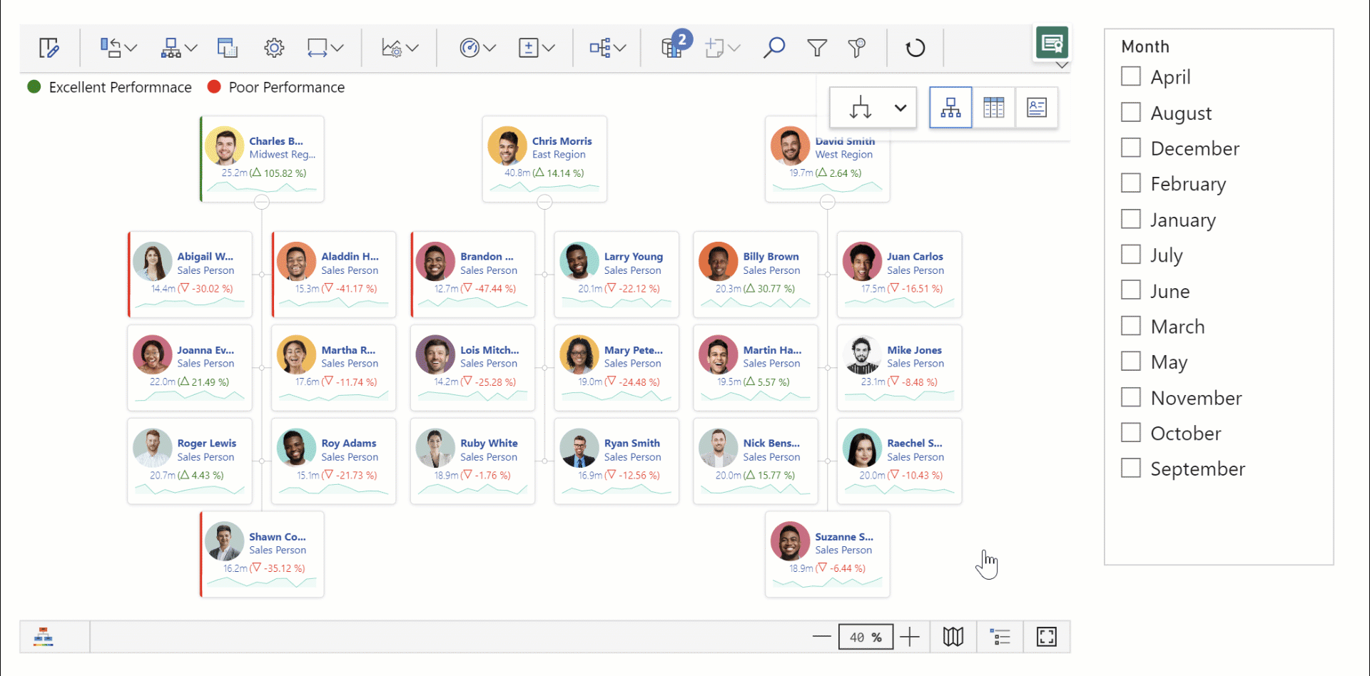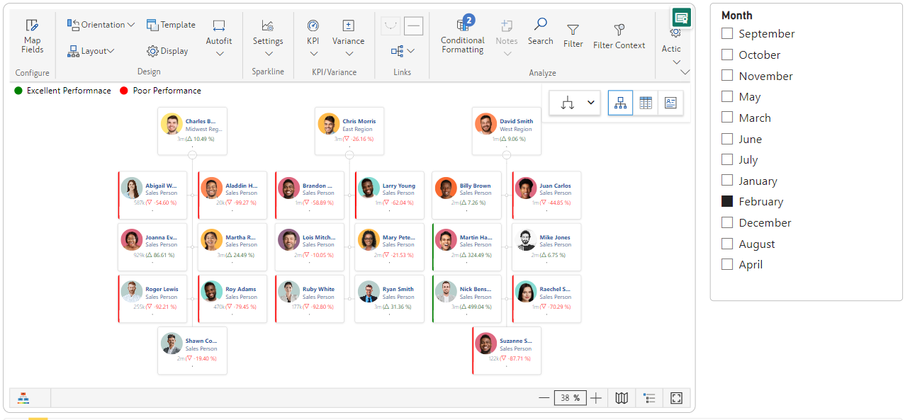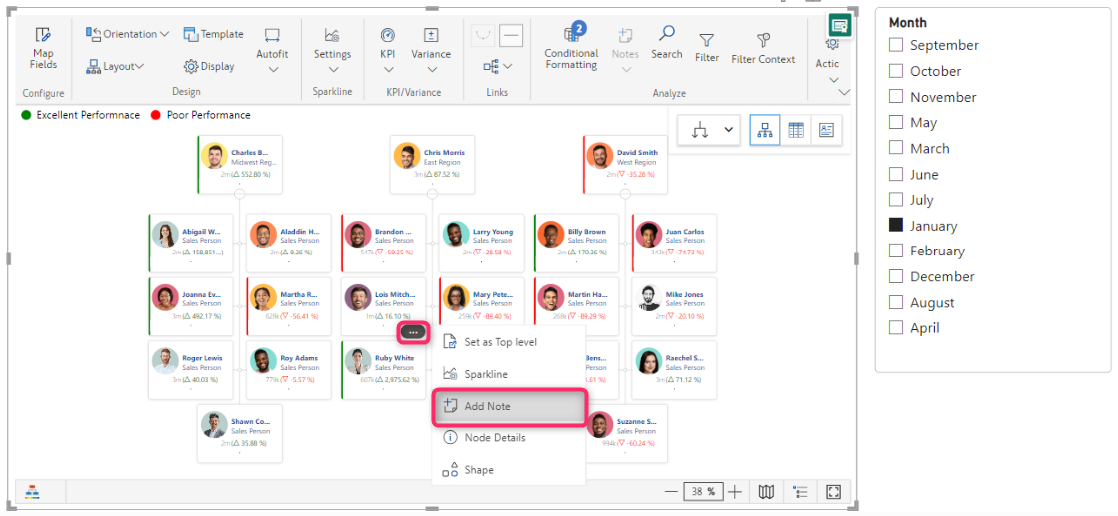 In January, Brandon’s low sales may be attributed to health issues and sick leave. A Data Analyst can add this note to Brandon's node. To analyze Brandon’s performance for the next coming month. The note is only displayed when January is selected in the Month slicer.