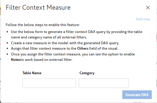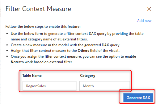 6. Click the Generate DAX button, and a new DAX measure will be generated. You can also add multiple slicers by clicking "Add New"