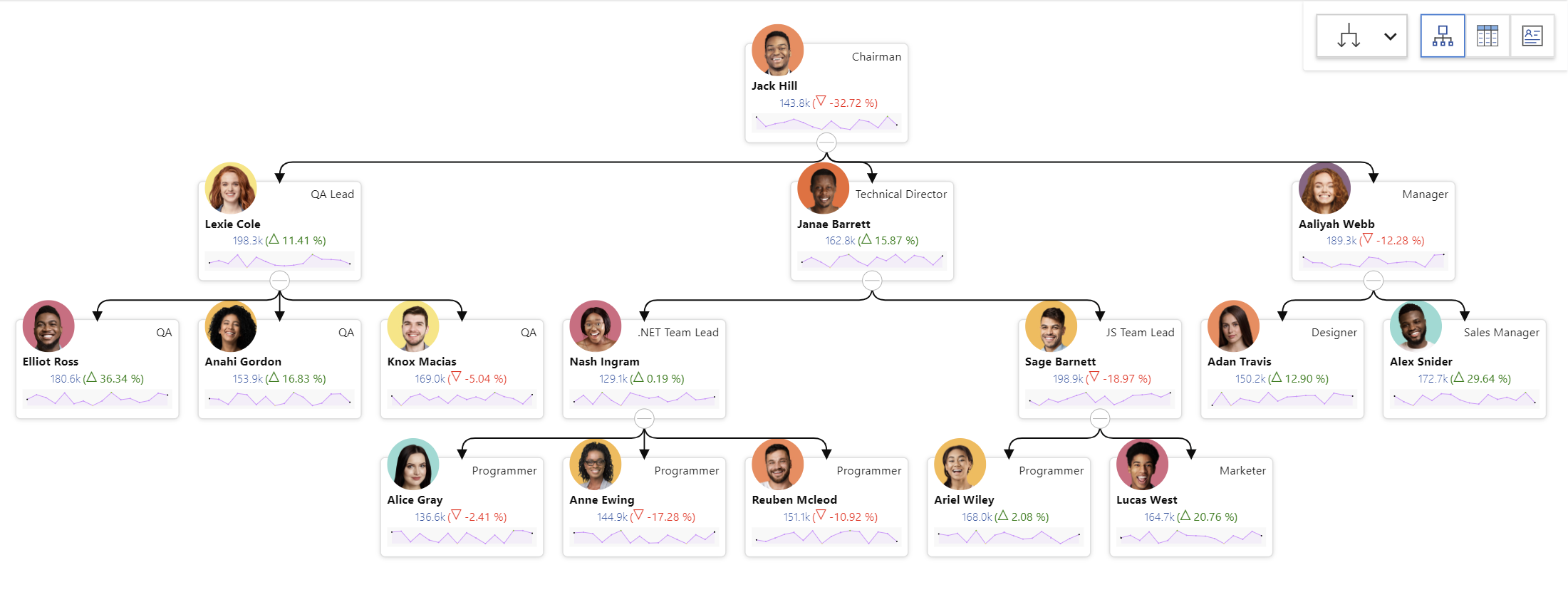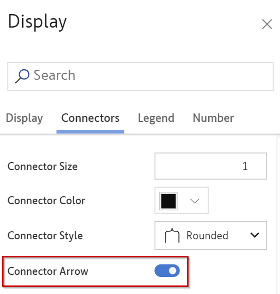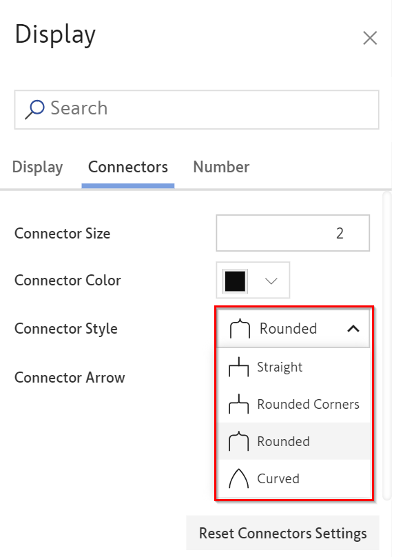 The xViz Performance Flow offers extensive customization options for connectors—the lines connecting the parent and child nodes—through the Connector Style feature in the "Display" section.