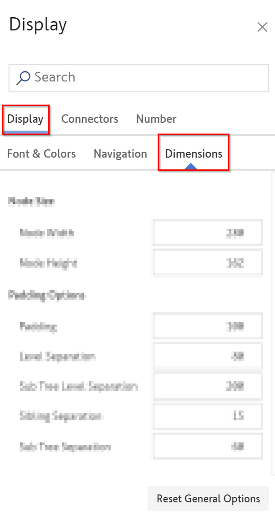 The xViz Performance Flow provides the customization options for Dimensions through the Node Size and Padding options in the Display section.