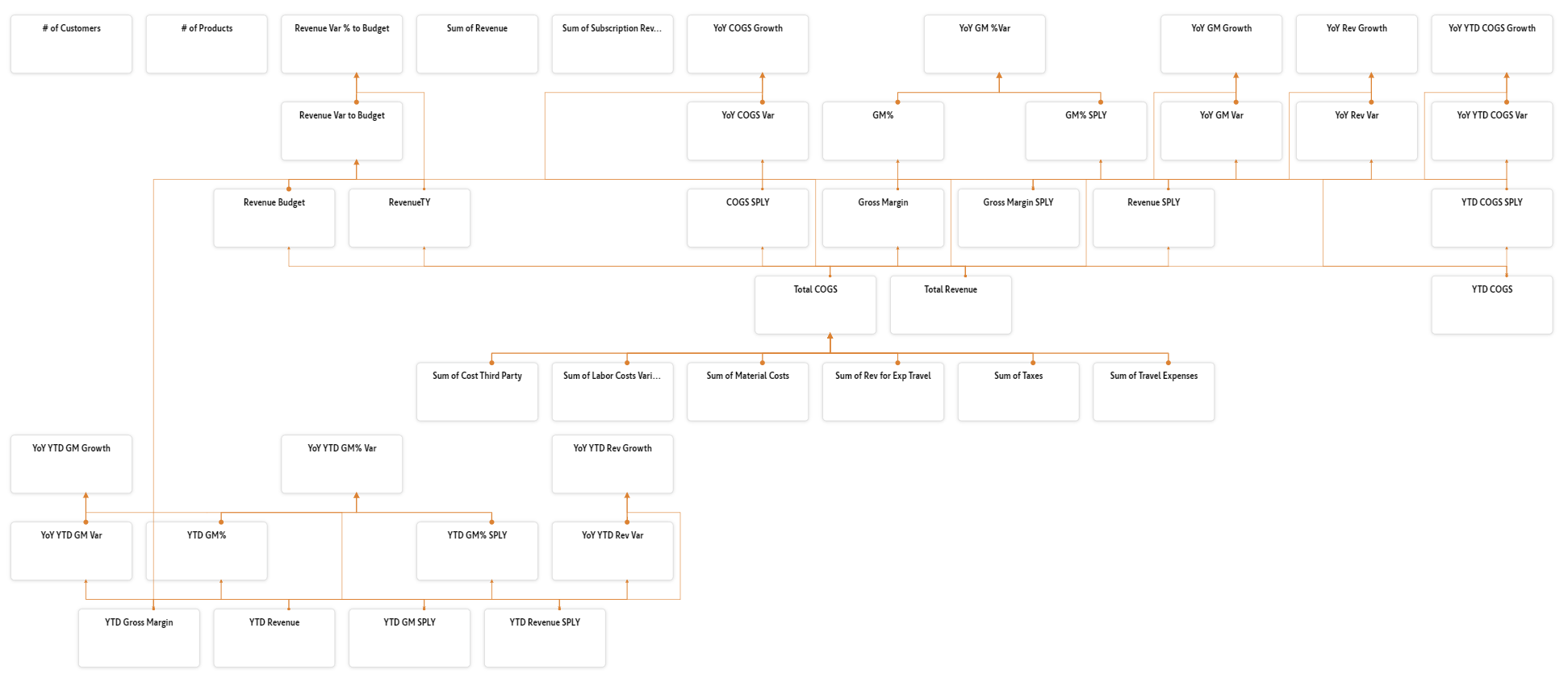 Leveraging the insights provided by [Power BI's new INFO functions](https://powerbi.microsoft.com/en-us/blog/power-bi-october-2024-feature-summary/#post-28196-_Toc179458536), the xViz Performance Flow visual offers a structured view of interconnected KPIs, dynamically updating the view ensures that users receive the most current information in the report.  With its capability to update as new KPIs are added, the xViz Performance Flow enables teams to stay informed of changes, supporting more effective analysis and management of key metrics across various performance dimensions.