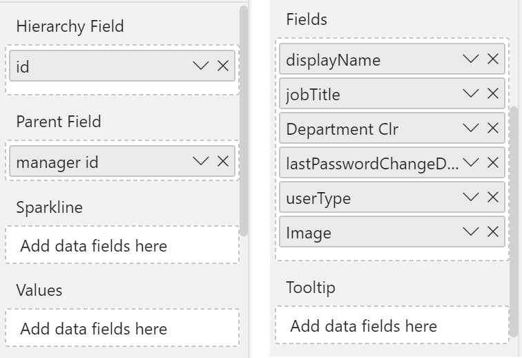 2. Next, populate the data fields in the visual with the relevant columns as shown below: