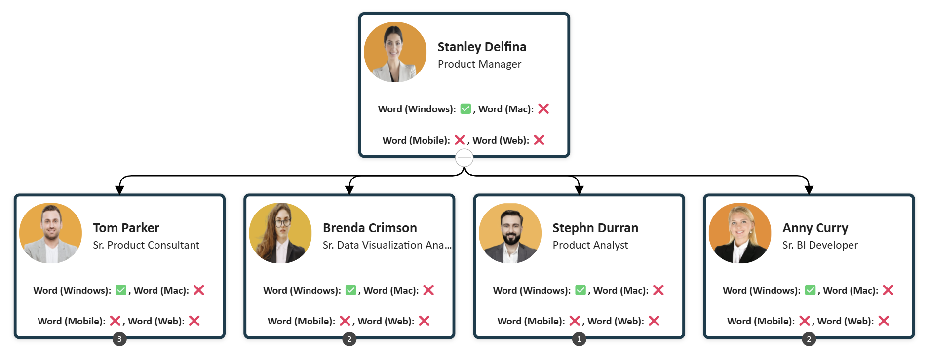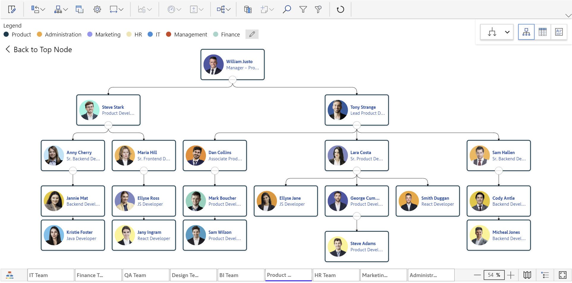 4. As a result, the organization chart is created using Microsoft Entra ID (formerly Azure Active Directory) data with the xViz Performance Flow Visual in Power BI.