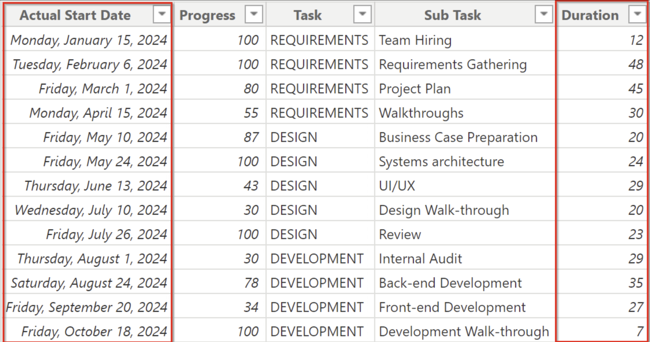 We have a dataset with an Actual Start Date and Duration column, but it does not include an Actual End Date column, as shown in the image below: