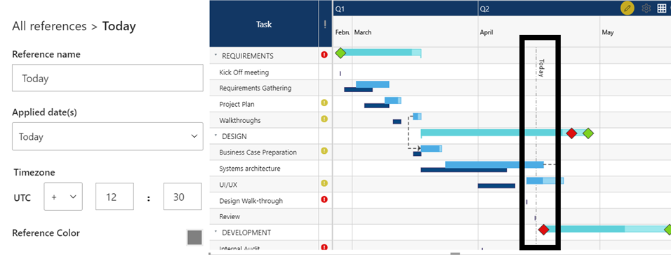 The xViz Gantt provides users the option to set multiple reference lines based on different logic: