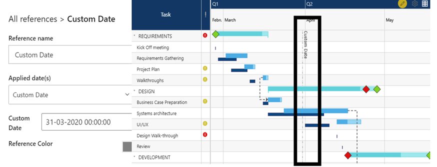 Image 6: Reference Line option Custom Date in the xViz Gantt Chart Formatting options for Reference Lines: