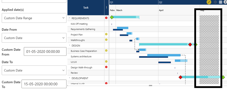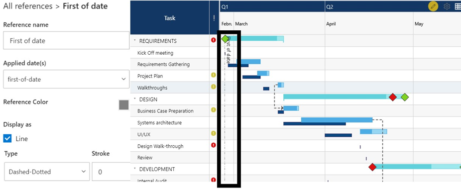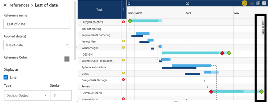 Image 3: Reference Line option First-of-date in the xViz Gantt Chart Last-of-date- Displays Reference Line on the latest start date from the data, where the Timeline ends.